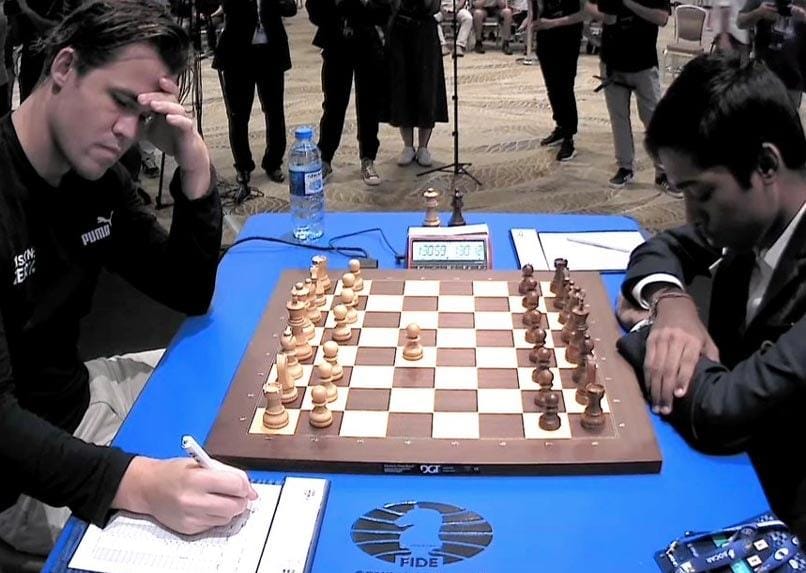 एक समय पहली बाजी बराबर छूटती दिखाई पड़ रही थी, लेकिन आखिरी पांच मिनट का दबाव और कार्लसन के अनुभव ने तेजी से सबकुछ पलट दिया