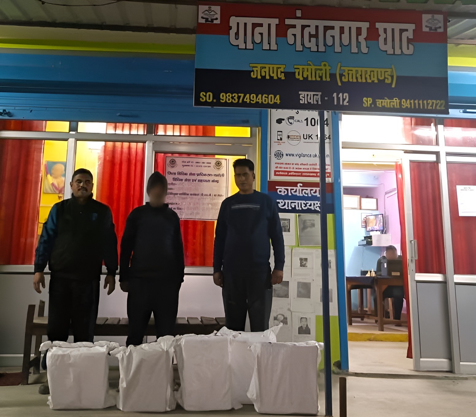 चमोली। पुलिस अधीक्षक चमोली सर्वेश पंवार द्वारा समस्त थाना, चौकी, एसओजी प्रभारियों को आगामी लोकसभा चुनाव 2024 के दौरान आदर्श आचार संहिता का पालन कराये जाने व अवैध नशे का कारोबार कर चुनाव को प्रभावित करने वाले तत्वों के विरूद्ध कड़ी कार्यवाही किये जाने हेतु निर्देशित किया गया है। आगामी लोकसभा चुनाव 2024 को सकुशल संपन्न कराने के लिए प्रतिबद्ध चमोली पुलिस ने चुनाव के दौरान अवैध शराब की तस्करी कर माहौल खराब करने व मतदाताओं को भ्रमित करने के प्रयासों को विफल करते एसओजी चमोली की टीम ने चैकिंग के दौरान अभियुक्त पंकज सिंह नेगी पुत्र राय सिंह नेगी उम्र 25 वर्ष तथा दीपक सिंह नेगी पुत्र राय सिंह नेगी उम्र 23 वर्ष निवासी ग्राम बूरा पोस्ट बूरा तहसील व थाना नन्दानगर जनपद चमोली को 11 पेटी अवैध अंग्रेजी शराब सोलमेट ब्लैक स्पेशल व्हिस्की के साथ गिरफ्तार किया गया। उक्त अभियुक्तों के विरुद्ध थाना नन्दानगर पर मुकदमा अपराध सख्या -10/24 धारा 60 आबकारी अधिनियम पंजीकृत किया गया है। अभियुक्तों को गिरफ्तार करने वाली पुलिस टीम मे उप निरीक्षक ध्वजवीर सिंह पंवार प्रभारी एसओजी, आरक्षी आशुतोष तिवारी एसओजी, आरक्षी चन्दन सिंह नगरकोटी एसओजी, आरक्षी राजेन्द्र सिंह रावत एसओजी, आरक्षी सलमान खान एसओजी व आरक्षी रविकांत एसओजी शामिल थे।