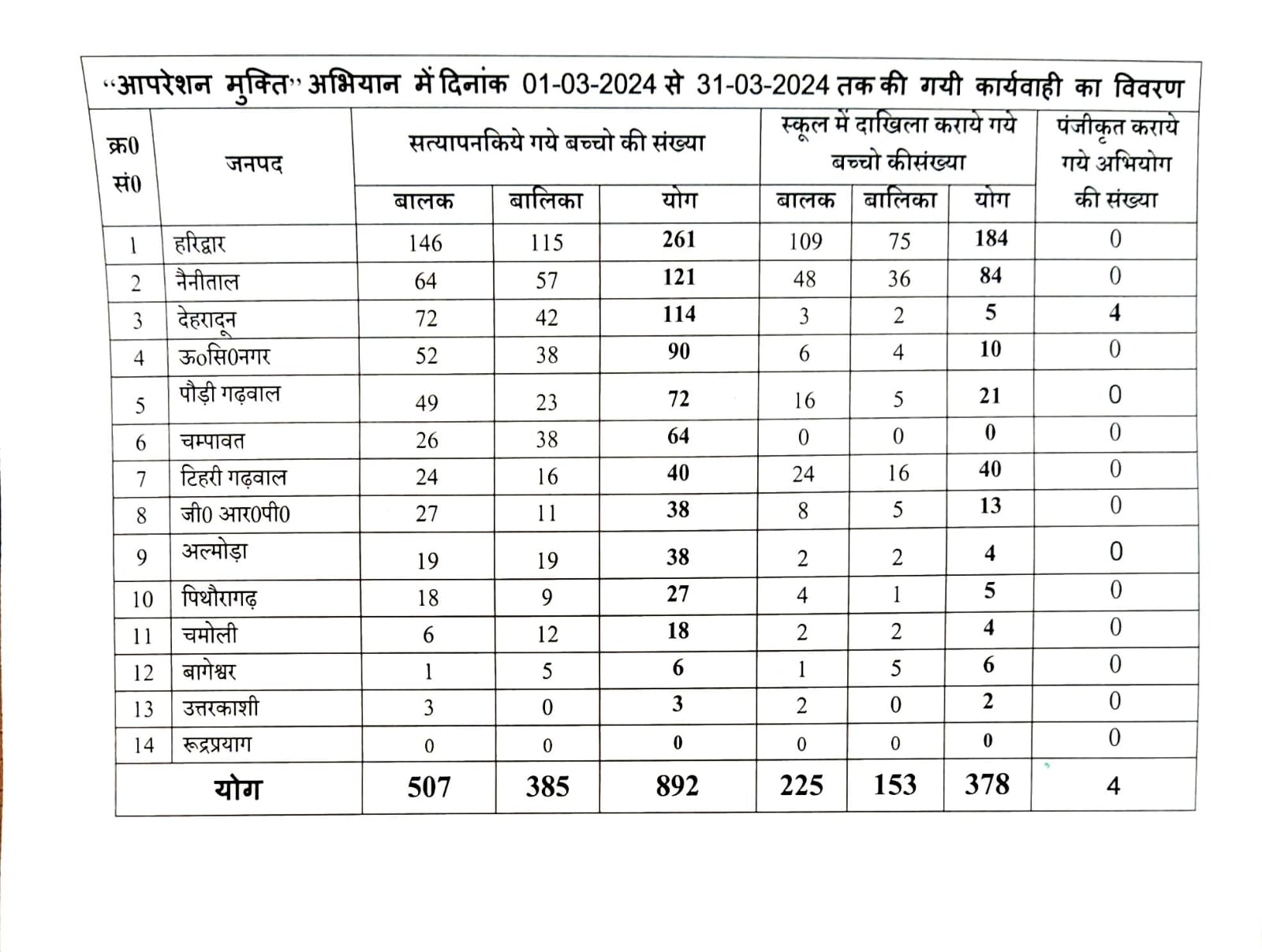 देहरादून। बच्चों से करायी जा रही भिक्षावृत्ति, बच्चों के साथ होने वाले अपराधों की रोकथाम, बच्चों को अपराध में संलिप्त होने से रोकने एवं उन्हें शिक्षा के लिए प्रेरित किये जाने हेतु ’’ऑपरेशन मुक्ति’’ अभियान 01 मार्च से 31 मार्च तक प्रदेश के समस्त जनपदों व रेलवेज में चलाया गया। समस्त जनपदों में एण्टी ह्यूमन ट्रैफिकिंग यूनिट द्वारा उक्त अभियान को चलाया गया। रेलवेज में भी एक टीम का गठन कर अभियान को चलाया गया।उक्त अभियान हेतु अन्य सम्बन्धित विभागों/स्वयं सेवी संस्थाओं का भी सहयोग लिया गया। अभियान जनपद के मुख्य-मुख्य स्थान जहां बच्चों द्वारा द्वारा भिक्षावृत्ति की जाती है, पर अभियान को चलाया गया, जिसमें भिक्षावृत्ति/ कूड़ा बीनने/ गुब्बारे बेचने आदि कार्यों में लिप्त बच्चों को रेस्क्यू कर उनका विद्यालयों में दाखिला कराये जाने हेतु कार्यवाही की गयी।स्कूल-कॉलेजों, सार्वजनिक स्थानों, महत्वपूर्ण चौराहों, सिनेमाघरों, बस व रेलवे स्टेशनों, धार्मिक स्थलों आदि स्थानों पर बच्चों को भिक्षा न दिये जाने के सम्बन्ध में विभिन्न माध्यमों से जागरूकता अभियान चलाकर छात्र-छात्राओं व जनता को जागरूक किया गया। उक्त अभियान में भिक्षा मांगने/ कूड़ाबीन ने/ गुब्बारे बेचने आदि कार्यों में लगे कुल 892 बच्चों का सत्यापन किया गया, सत्यापन किये गये 892 बच्चों में से कुल 378 बच्चों का विद्यालयों में दाखिला कराया गया, अन्य बच्चों के विद्यालयों में दाखिला कराये जाने की कार्यवाही प्रचलित है। अभियान के दौरान बच्चों से भिक्षावृत्ति करवाने वाला कोई गैंग प्रकाश में नहीं आया। अभियान के दौरान बाल श्रम करते पाये गये 06 बच्चों को रेस्क्यू कर नियोजकों के विरूद्ध 02 अभियोग तथा भिक्षावृत्ति करते पाये गये 08 व्यक्तियों के विरूद्ध 02 अभियोग पंजीकृत कराये गये। वर्ष 2017 से अब तक 8562 बच्चों का सत्यापन किया जा चुका है तथा 3981 बच्चों का स्कूलों में दाखिला कराया गया है।