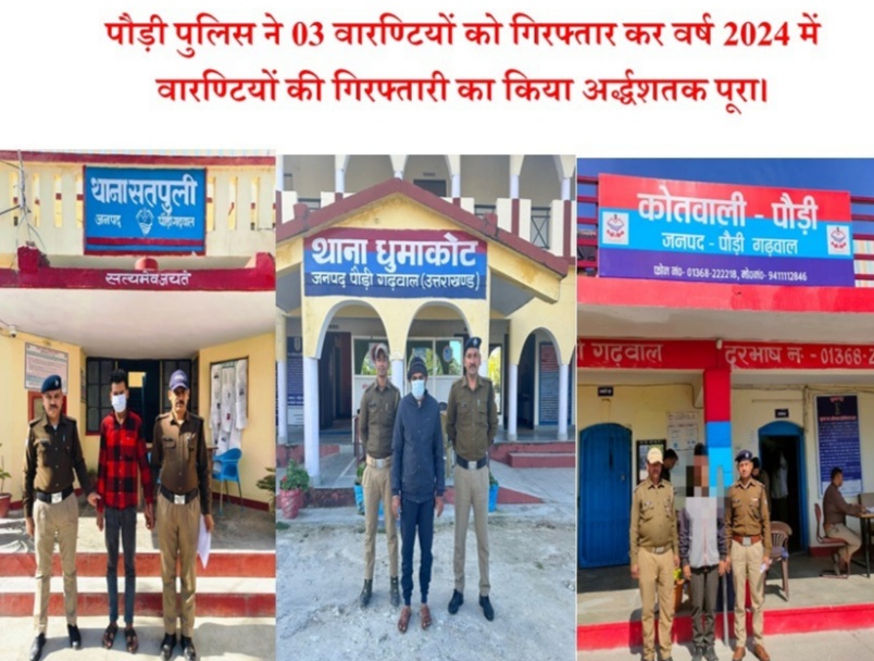 कोटद्वार, पौड़ी। आगामी लोक सभा चुनाव के दृष्टिगत वरिष्ठ पुलिस अधीक्षक पौड़ी लोकेश्वर सिंह द्वारा जनपद के समस्त थाना प्रभारियों को प्रभावी निरोधात्मक कार्यवाही करने के साथ-साथ न्यायालय से प्राप्त गैर जमानती वारण्ट की शत प्रतिशत तामील कर अभियुक्त को गिरफ्तार कर न्यायालय के समक्ष पेश किये जाने के निर्देश पर थाना धुमाकोट पुलिस टीम द्वारा न्यायालय प्रथम श्रेणी धुमाकोट द्वारा जारी वाद आबकारी अधिनियम से सम्बन्धित वारण्टी जमील निवासी मौ. ताज हरमतपुर, थाना बिलापुर, जनपद रामपुर उप्र को गिरफ्तार किया गया। थाना पौड़ी पुलिस टीम द्वारा न्यायालय न्यायिक मजिस्ट्रेट पौड़ी द्वारा जारी वारण्टी राकेश चौहान निवासी ग्राम केसुन्दर, थाना पौड़ी जनपद पौड़ी गढ़वाल को गिरफ्तार किया गया। इसके अलावा थाना सतपुली पुलिस टीम द्वारा न्यायालय प्रथम श्रेणी लैन्सडाउन द्वारा वाद जारी संख्या 196 मोटर वाहन से सम्बन्धित वारण्टी सौरभ कुमार निवासी ग्राम भट्टी, पट्टी असवालस्यु (राजस्व क्षेत्र) जनपद पौड़ी गढ़वाल को गिरफ्तार किया गया।जनपद पौड़ी गढ़वाल पुलिस द्वारा इस वर्ष माह जनवरी से अब तक 51 वारणटियों को गिरफ्तार किया गया है।