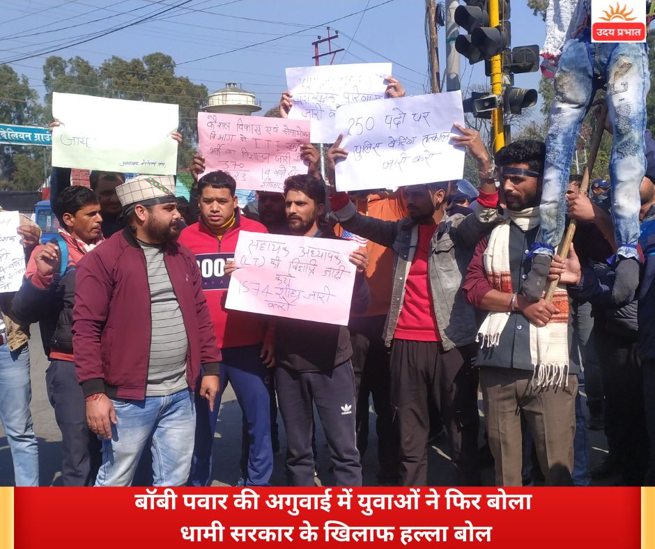 देहरादून: आज दिनांक 9 फरवरी, 2024 को लैंसडाउन चौक के पास बाॅबी पंवार, अध्यक्ष बेरोजगार संघ की अगुवाई में युवाओं ने एक बार फिर से धामी सरकार के खिलाफ हल्ला बोल किया, युवाओं ने आरोप लगाया कि मुख्यमंत्री पुष्कर सिंह धामी ने उत्तराखंड के युवाओं से वायदा किया था कि वह भर्ती परीक्षाओं के लिए सीबीआई उत्तराखंड में लेकर आएंगे और पुरानी परीक्षा में हुई धांधली की सीबीआई जांच करवाएंगे, लेकिन एक वर्ष से ज्यादा का समय बीतने पर भी अभी तक किसी भी तरह की कोई भी जांच धामी सरकार ने परीक्षाओं को लेकर नहीं कराई है, युवाओं ने लैंसडाउन चौक देहरादून में धामी सरकार का पुतला दहन किया