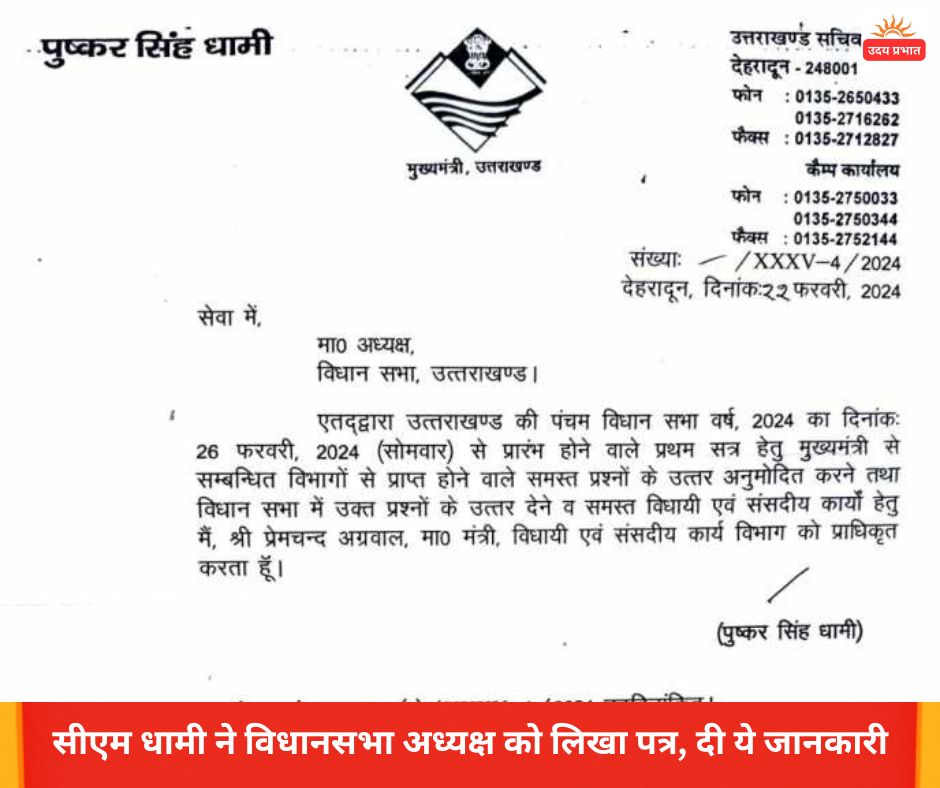 उत्तराखण्ड की पंचम विधान सभा वर्ष, 2024 का दिनांकः 26 फरवरी, 2024 (सोमवार) से प्रारंभ होने वाले प्रथम सत्र हेतु मुख्यमंत्री से सम्बन्धित विभागों से प्राप्त होने वाले समस्त प्रश्नों के उत्तर अनुमोदित करने तथा विधान सभा में उक्त प्रश्नों के उत्तर देने व समस्त विधायी एवं संसदीय कार्यों हेतु मैं, श्री प्रेमचन्द अग्रवाल, मा० मंत्री, विधायी एवं संसदीय कार्य विभाग को प्राधिकृत करता हूँ।