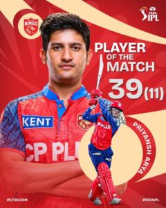 शानदार बल्लेबाजी के लिए प्रियांश आर्या को प्लेयर ऑफ द मैच चुना गया।