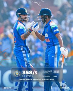 तो वहीं विराट कोहली भी अपना शतक पूरा किया. कोहली ने 90 बॉल में 7 चौके और 2 छक्कों के साथ 100 रन पूरे किए. उन्होंने 93 बॉल में 102 रनों की पारी खेली और वनडे क्रिकेट में अपना 53वां शतक लगाया. उनके अलावा कप्तान केएल राहुल ने अपना अर्धशतक पूरा किया. राहुल ने 43 बॉल में 6 चौके और 2 छक्कों के साथ 66 रनों की पारी खेली. दक्षिण अफ्रीका के लिए इस मैच में मार्को जानसेन ने 2 चटकाए, जबकि नांद्रे बर्गर और लुंगी एनगिडी ने 1-1 विकेट लिया.
