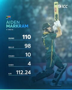मार्करम की मैच जिताऊ पारी की बदौलत उन्हें प्लेयर ऑफ द मैच चुना गया। दक्षिण अफ्रीकी टीम ने भारत के खिलाफ लक्ष्य का पीछा करते हुए यह संयुक्त रूप से सबसे बड़ा सफल चेज़ किया है। इससे पहले 2019 में ऑस्ट्रेलिया ने मोहाली में भारत के खिलाफ इतने ही रनों का पीछा किया था। यह दक्षिण अफ्रीका की रनों का पीछा करते हुए तीसरी सबसे बड़ी जीत भी है।
