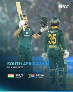 Ind vs SA 2nd ODI: दक्षिण अफ्रीका ने रायपुर के शहीद वीर नारायण सिंह इंटरनेशनल क्रिकेट स्टेडियम में खेले गए दूसरे वनडे में भारत को 4 विकेट से मात देकर तीन मैचों की सीरीज 1-1 से बराबर कर दी। भारत ने टॉस हारने के बाद पहले बल्लेबाजी करते हुए निर्धारित 50 ओवर में 5 विकेट खोकर 358 रन बनाए। जवाब में दक्षिण अफ्रीका ने लक्ष्य का पीछा करते हुए 49.2 ओवर में 6 विकेट के नुकसान पर 362 रन बनाकर मैच अपने नाम कर लिया।