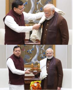 मुख्यमंत्री पुष्कर सिंह धामी ने नई दिल्ली में प्रधानमंत्री नरेंद्र मोदी से शिष्टाचार भेंट की। मुख्यमंत्री ने प्रधानमंत्री को उत्तराखंड में आयोजित राष्ट्रीय खेलों के लिए आमंत्रित किया। उन्होंने प्रधानमंत्री को मलारी (चमोली) की शॉल और नारायण आश्रम की प्रतिकृति भेंट की।