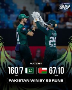 दुबई: पाकिस्तान ने शुक्रवार (12 सितंबर) को दुबई अंतरराष्ट्रीय क्रिकेट स्टेडियम में खेले गए ग्रुप-ए मुकाबले में ओमान को 93 रनों से हराकर एशिया कप में विजयी आगाज़ किया। टॉस जीतकर पहले बल्लेबाजी करते हुए पाकिस्तान ने 20 ओवरों में 7 विकेट खोकर 160 रन बनाए। टीम के लिए मोहम्मद हारिस हीरो साबित हुए, जिन्होंने 32 गेंदों पर 66 रन की शानदार पारी खेली। उनकी पारी में 7 चौके और 3 छक्के शामिल रहे। वहीं, फखर जमान ने नाबाद 23 रन का योगदान दिया।