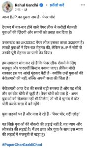 राहुल गांधी ने अपने एक्स (पूर्व ट्विटर) अकाउंट पर लिखा, “देशभर में बार-बार होने वाले पेपर लीक ने करोड़ों मेहनती युवाओं की जिंदगी और सपनों को तबाह कर दिया है। उत्तराखंड का UKSSSC पेपर लीक इसका ताजा उदाहरण है। लाखों युवाओं ने दिन-रात मेहनत की, लेकिन भाजपा ने चोरी से उनकी मेहनत पर पानी फेर दिया। हम लगातार मांग कर रहे हैं कि पेपर लीक रोकने के लिए मज़बूत और पारदर्शी सिस्टम बने, लेकिन मोदी सरकार आंख मूंदकर बैठी है। उन्हें युवाओं की बेरोज़गारी की चिंता नहीं, बल्कि सत्ता की चिंता है।”