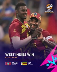 टॉस जीतकर जिम्बाब्वे ने पहले गेंदबाजी चुनी, लेकिन यह फैसला उस पर भारी पड़ गया। वेस्टइंडीज ने 20 ओवर में 6 विकेट खोकर 254 रन ठोक दिए, जो इस टूर्नामेंट का अब तक का सबसे बड़ा स्कोर रहा।