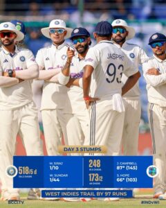भारत की पहली पारी 518 रन पर समाप्त हुई थी। वेस्टइंडीज की पहली पारी तीसरे दिन 248 रन पर सिमट गई थी, जिसमें एलिक अथानजे 41 रन बनाकर टीम के टॉप स्कोरर रहे। भारत की तरफ से कुलदीप यादव ने 5 और जडेजा ने 3 विकेट लिए, जबकि बुमराह और सिराज को 1-1 विकेट मिला।