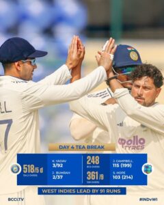 फॉलोऑन खेलते हुए वेस्टइंडीज की दूसरी पारी ने पहली पारी की तुलना में शानदार बल्लेबाजी दिखाई। कैंपबेल और होप की साझेदारी ने टीम को पारी की हार से बचाने में महत्वपूर्ण योगदान दिया। चौथे दिन के खेल ने साफ कर दिया है कि वेस्टइंडीज भारत को आसान हार नहीं देगा।
