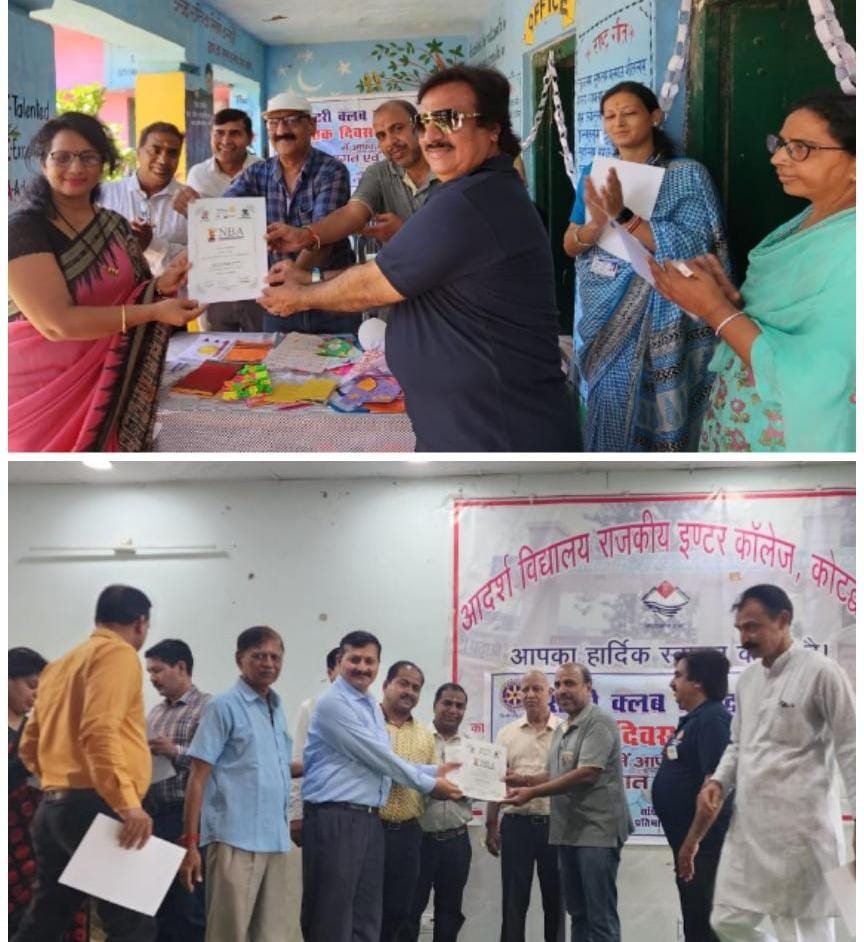 कोटद्वार। रोटरी क्लब कोटद्वार के तत्वावधान में शिक्षक दिवस के उपलक्ष्य में कोटद्वार के विभिन्न स्कूलों के 95 शिक्षक व शिक्षिकाओं को नेशन बिल्डर अवार्ड से सम्मानित किया गया। नजीबाबाद रोड़ स्थित रोटरी सामुदायिक केंद्र में आयोजित उक्त शिक्षक सम्मान समारोह का शुभारंभ रोटरी अध्यक्ष रो० कुलदीप अग्रवाल ने किया। इस अवसर उन्होंने कहा कि भारतीय संस्कृति व समाज मे शिक्षक का सर्वोत्तम स्थान है । शिक्षक को हमेशा समाजोपयोगी शिक्षा बच्चो को देनी चाहिए। इस अवसर पर रेनू नेगी, डाॅ० के एस नेगी, अनीत चावला, अनिल भोला, विजय कुमार माहेश्वरी, सुनीता मधवाल, मुकेश रावत ने विचार व्यक्त किए। कार्यक्रम का संचालन रो० वाई० पी० गिलरा ने किया। कार्यक्रम की समस्त व्यवस्था संयोजक अनीत चावला ने की। इस अवसर पर आर्य कन्या इण्टर कालेज की प्रधानाचार्या रेनू नेगी सहित 11 शिक्षिकाएं, राजकीय कन्या इण्टर कालेज की प्रधानाचार्या सुनीता मधवाल सहित 32 शिक्षिकाएं, राजकीय इण्टर कालेज के प्रधानाचार्य मुकेश रावत सहित 33 शिक्षक, प्राथमिक विद्यालय सुखरौ की प्रधानाचार्या कल्पना तिवारी सहित 5 शिक्षक, प्राथमिक विद्यालय न०1 के 3 शिक्षक, प्राथमिक विद्यालय न० 6 के 2 शिक्षक, प्राथमिक विद्यालय न० 8 के 3 शिक्षक व कान्ता प्रसाद राजपूत, बीना रावत, डाॅ० के० एस० नेगी, डाॅ० संध्या नेगी सहित कुल 95 शिक्षक व शिक्षिकाओं को राष्ट्रीय निर्माता पुरस्कार से सम्मानित किया गया। इस अवसर पर अध्यक्ष रो० कुलदीप अग्रवाल, सचिव रो० प्रतिभा गुप्ता, कोषाध्यक्ष रो० सचिन गोयल, उपसचिव रो० डी० पी० सिंह, रो० अनीत चावला, रो० वाई० पी० गिलरा, रो० अनिल भोला, रो० गोपाल बंसल, रो० विजय कुमार माहेश्वरी सीनियर, रो० धनेश अग्रवाल, रो० शरत चन्द्र गुप्ता, रो० राजेश गुप्ता, रो० अशोक अग्रवाल, रो० अमित अग्रवाल, रो० गुरुबचन सिंह, डॉ० के एस नेगी, डाॅ० संध्या नेगी, बीना रावत, रो० विजय कुमार माहेश्वरी जूनियर, डाॅ० एन० पी० पोखरियाल, रो० कमल गुप्ता आदि सदस्य मौजूद थे।