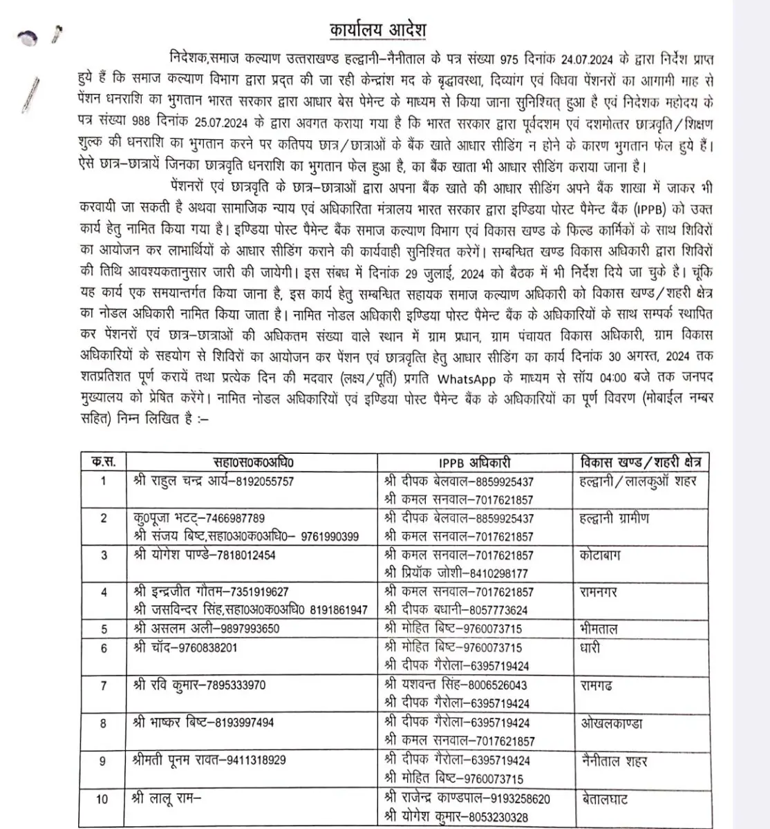 हल्द्वानी :(बड़ी खबर) पेंशनर और छात्रवृत्ति वाले छात्रों के लिए महत्वपूर्ण खबर समाज कल्याण उत्तराखण्ड हल्द्वानी-नैनीताल के पत्र संख्या 975 दिनांक 24.07.2024 के द्वारा निर्देश प्राप्त हुये हैं कि समाज कल्याण विभाग द्वारा प्रदत की जा रही केन्द्रांश मद के बृद्धावस्था, दिव्यांग एवं विधवा पेंशनरों का आगामी माह से पेंशन धनराशि का भुगतान भारत सरकार द्वारा आधार बेस पेमेन्ट के माध्यम से किया जाना सुनिश्चित् हुआ है एवं निदेशक महोदय के पत्र संख्या 988 दिनांक 25.07.2024 के द्वारा अवगत कराया गया है कि भारत सरकार द्वारा पूर्वदशम एवं दशमोत्तर छात्रवृति / शिक्षण शुल्क की धनराशि का भुगतान करने पर कतिपय छात्र/छात्राओं के बैंक खाते आधार सीडिंग न होने के कारण भुगतान फेल हुये हैं। ऐसे छात्र-छात्रायें जिनका छात्रवृति धनराशि का भुगतान फेल हुआ है, का बैंक खाता भी आधार सीडिंग कराया जाना है।पेंशनरों एवं छात्रवृति के छात्र-छात्राओं द्वारा अपना बैंक खाते की आधार सीडिंग अपने बैंक शाखा में जाकर भी करवायी जा सकती है अथवा सामाजिक न्याय एवं अधिकारिता मंत्रालय भारत सरकार द्वारा इण्डिया पोस्ट पैमेन्ट बैंक (IPPB) को उक्त कार्य हेतु नामित किया गया है। इण्डिया पोस्ट पैमेन्ट बैंक समाज कल्याण विभाग एवं विकास खण्ड के फिल्ड कार्मिकों के साथ शिविरों का आयोजन कर लाभार्थियों के आधार सीडिंग कराने की कार्यवाही सुनिश्चित करेगें। सम्बन्धित खण्ड विकास अधिकारी द्वारा शिविरों की तिथि आवश्यकतानुसार जारी की जायेगी। इस संबध में दिनांक 29 जुलाई, 2024 को बैठक में भी निर्देश दिये जा चुके है। चूंकि यह कार्य एक समयान्तर्गत किया जाना है, इस कार्य हेतु सम्बन्धित सहायक समाज कल्याण अधिकारी को विकास खण्ड/शहरी क्षेत्र का नोडल अधिकारी नामित किया जाता है। नामित नोडल अधिकारी इण्डिया पोस्ट पैमेन्ट बैंक के अधिकारियों के साथ सम्पर्क स्थापित कर पेंशनरों एवं छात्र-छात्राओं की अधिकतम संख्या वाले स्थान में ग्राम प्रधान, ग्राम पंचायत विकास अधिकारी, ग्राम विकास अधिकारियों के सहयोग से शिविरों का आयोजन कर पेंशन एवं छात्रवृत्ति हेतु आधार सीडिंग का कार्य दिनांक 30 अगस्त, 2024 तक शतप्रतिशत पूर्ण करायें तथा प्रत्येक दिन की मदवार (लक्ष्य / पूर्ति) प्रगति WhatsApp के माध्यम से सॉय 04:00 बजे तक जनपद मुख्यालय को प्रेषित करेंगे। नामित नोडल अधिकारियों एवं इण्डिया पोस्ट पैमेन्ट बैंक के अधिकारियों का पूर्ण विवरण (मोबाईल नम्बर सहित) निम्न लिखित है