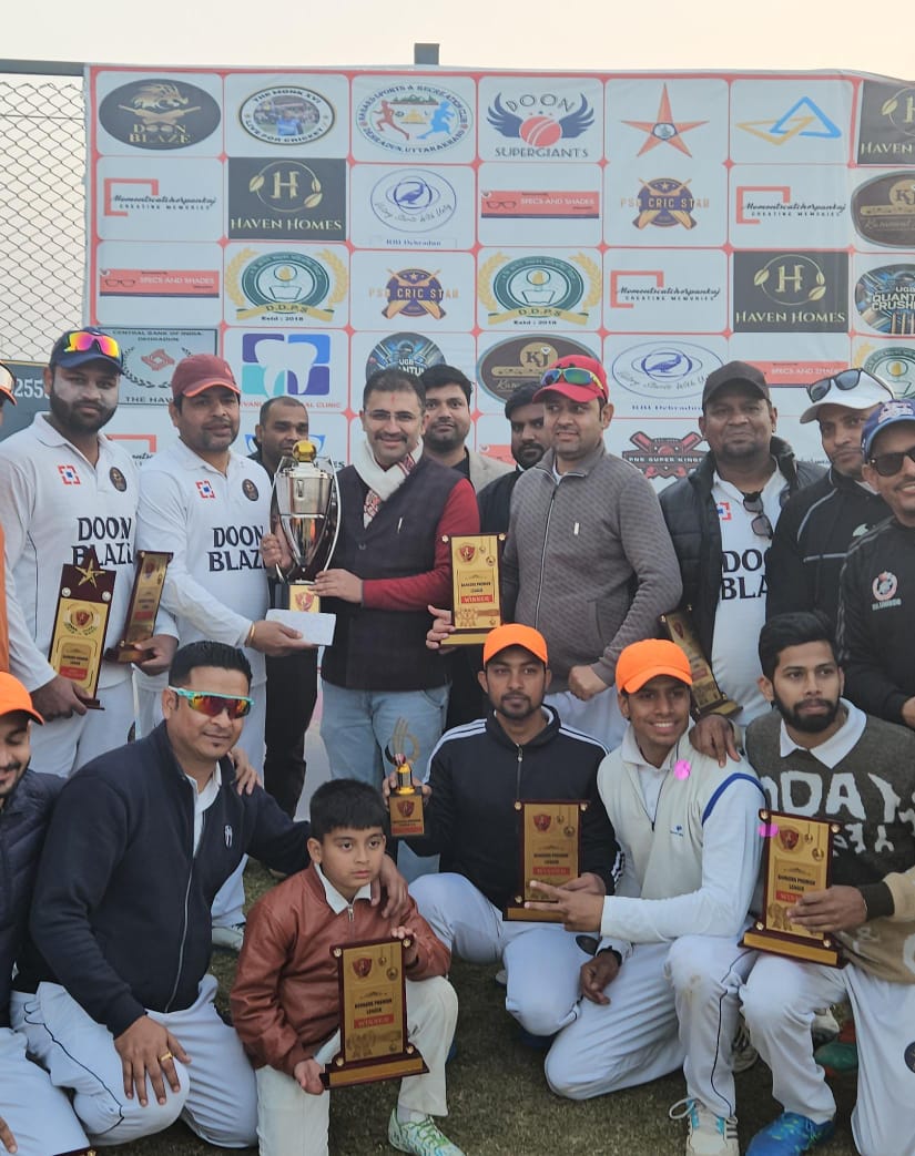 देहरादून में 09 नवंबर 2024 से चल रहे 12 टीमों के Bankers Premiere League 2.0 क्रिकेट टूर्नामेंट में फाइनल मैच अपने आर्यन क्षेत्री स्टेडियम में BOB BLACKHAWKS और DOON BLAZE HAI FINAL MEI के बीच खेला गया। टूर्नामेंट का ऑनलाइन LIVE प्रसारण व स्कोर बोर्ड की व्यवस्था करी गयी । आज इस टूर्नामेंट के फाइनल में DOON BLAZE टीम ने BOB BLACKHAWKS टीम को रोमांचक मुकाबले में 23 रनों से परस्त किया। मैन ऑफ़ द मैच शुभम जैन ने 5 विकेट लिये, रविंद्र सिंह तोमर को सर्वश्रेष्ठ गेंदबाज और योगेश को मैन ऑफ़ द सीरीज का पुरस्कार मिला।