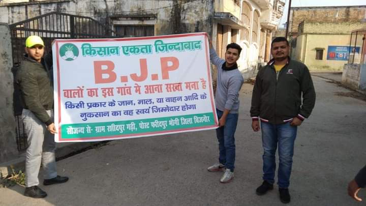 प्राप्त समाचार के अनुसार जनपद बिजनौर के ग्राम रशीदपुर गढ़ी में किसानो के समर्थन में उतरे ग्रामीणो ने जगह जगह बैनर चस्पा कर दिए। जिसमे बड़े बड़े अक्षरों में साफ तौर पर लिखा है कि इस गांव में बीजेपी कार्यकर्ताओं का आना सख्त मना है। गांव में आने वाले बीजेपी समर्थक , नेता और मंत्री अपनी जान माल की हानि के स्वयं जिम्मेदार होंगे। उधर दीवारों पर चस्पा हुए इन पोस्टरों के सोशल मीडिया पर वायरल(Viral) होते ही बीजेपी समर्थकों सहित नेताओ में हड़कंप मच गया है। जिसके बाद बीजेपी के नेताओ से यह विरोध न तो उगलते ही बन रहा है और न ही निगलते बन रहा है। जिसके कारण कोई भी नेता कुछ बोलने को तैयार नही है।